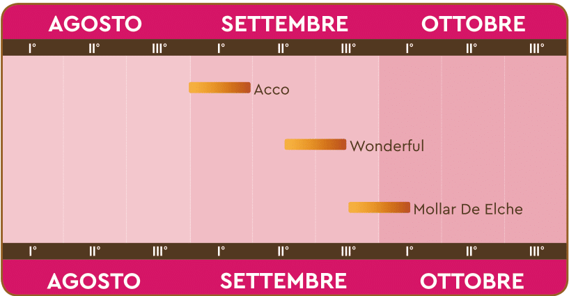 Qui troverete schematizzate le diverse epoche di maturazione di tutte le varietà di melograni presenti nel nostro catalogo